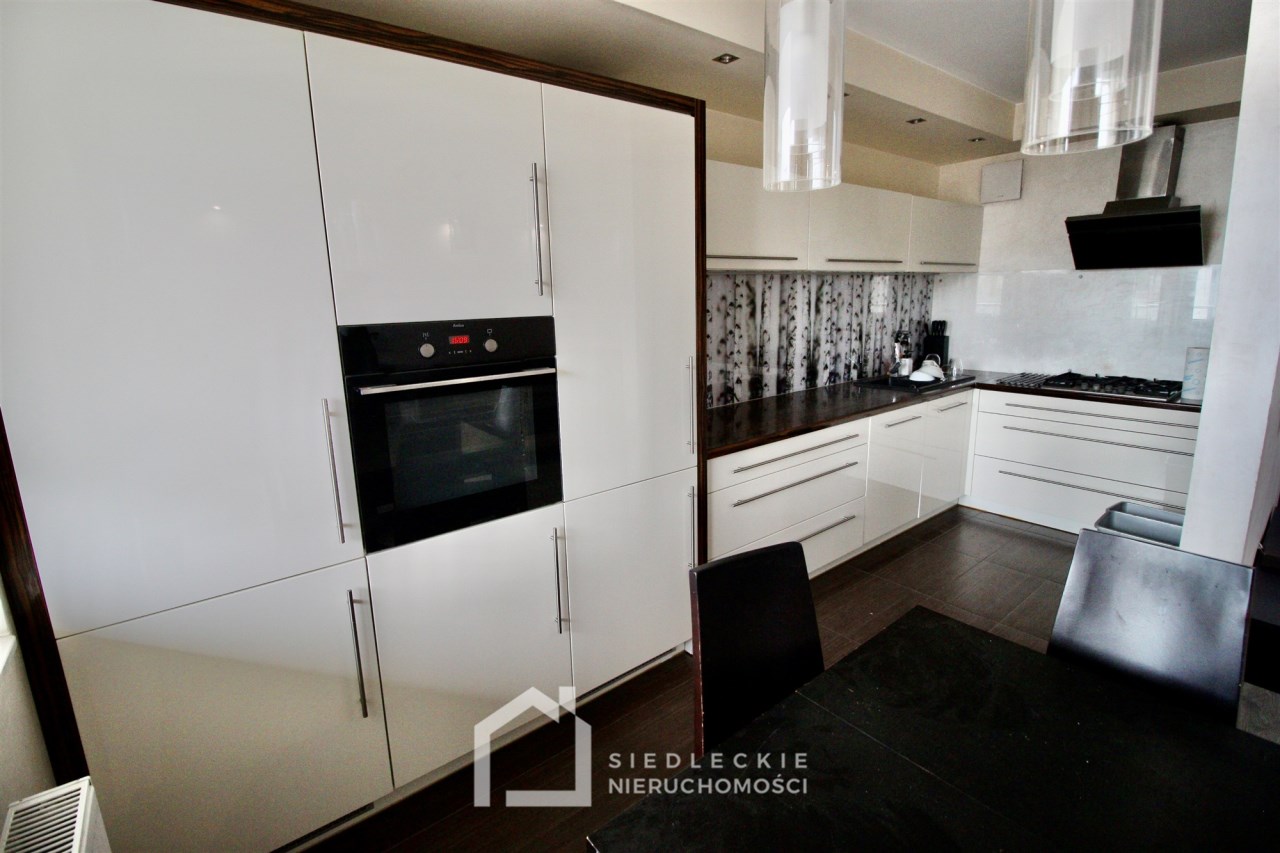 Kuchnia z meblami w zabudowie jest wyposażona w sprzęt AGD – płytę gazową, piekarnik, lodówkę, zmywarkę oraz okap. W salonie zamontowana jest klimatyzacja.