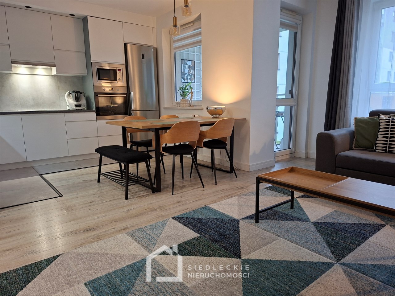 Kuchnia z meblami w zabudowie jest wyposażona w sprzęt AGD – płytę indukcyjną, piekarnik, lodówkę, zmywarkę oraz okap.