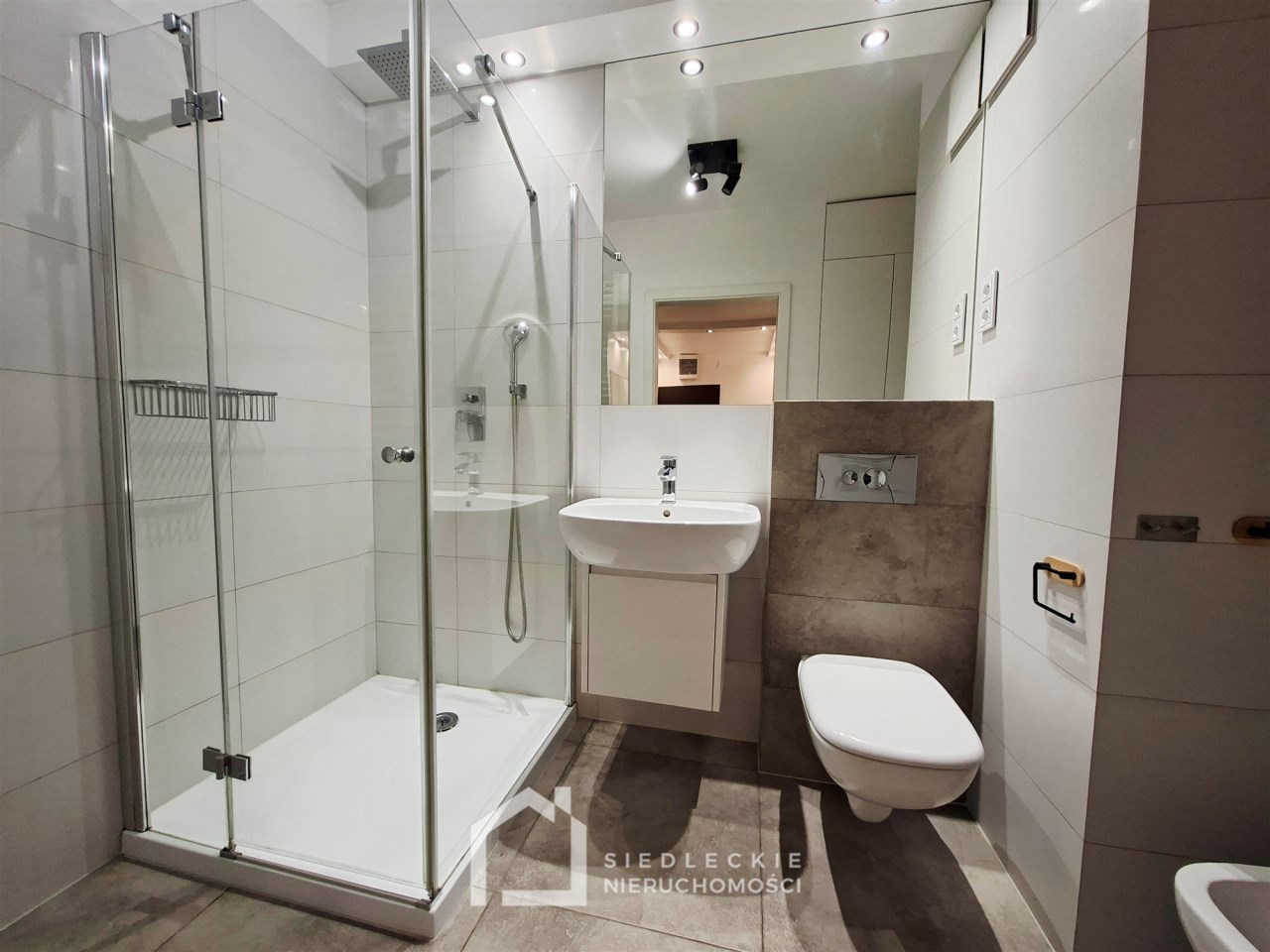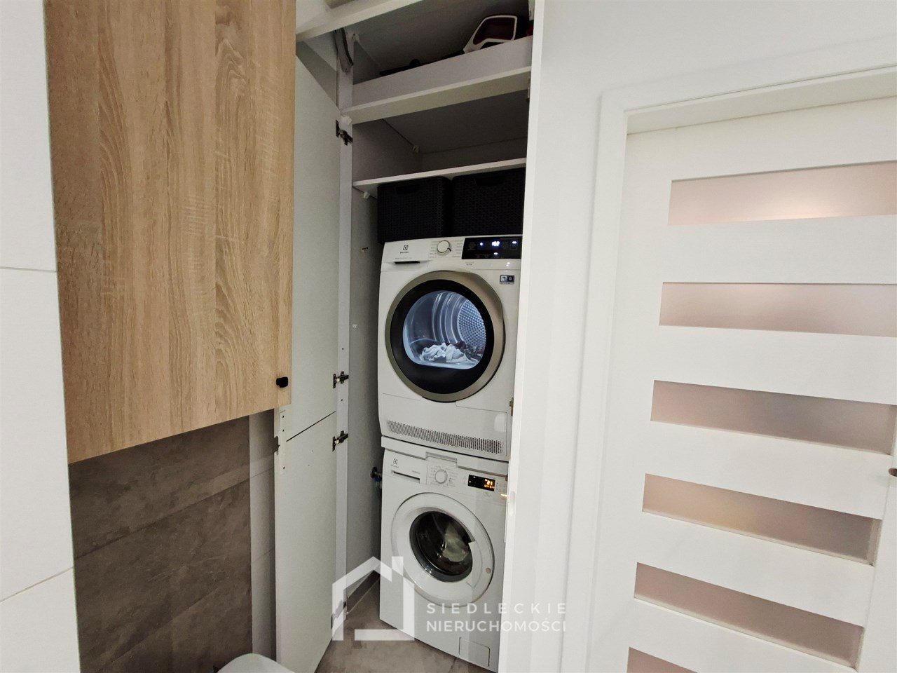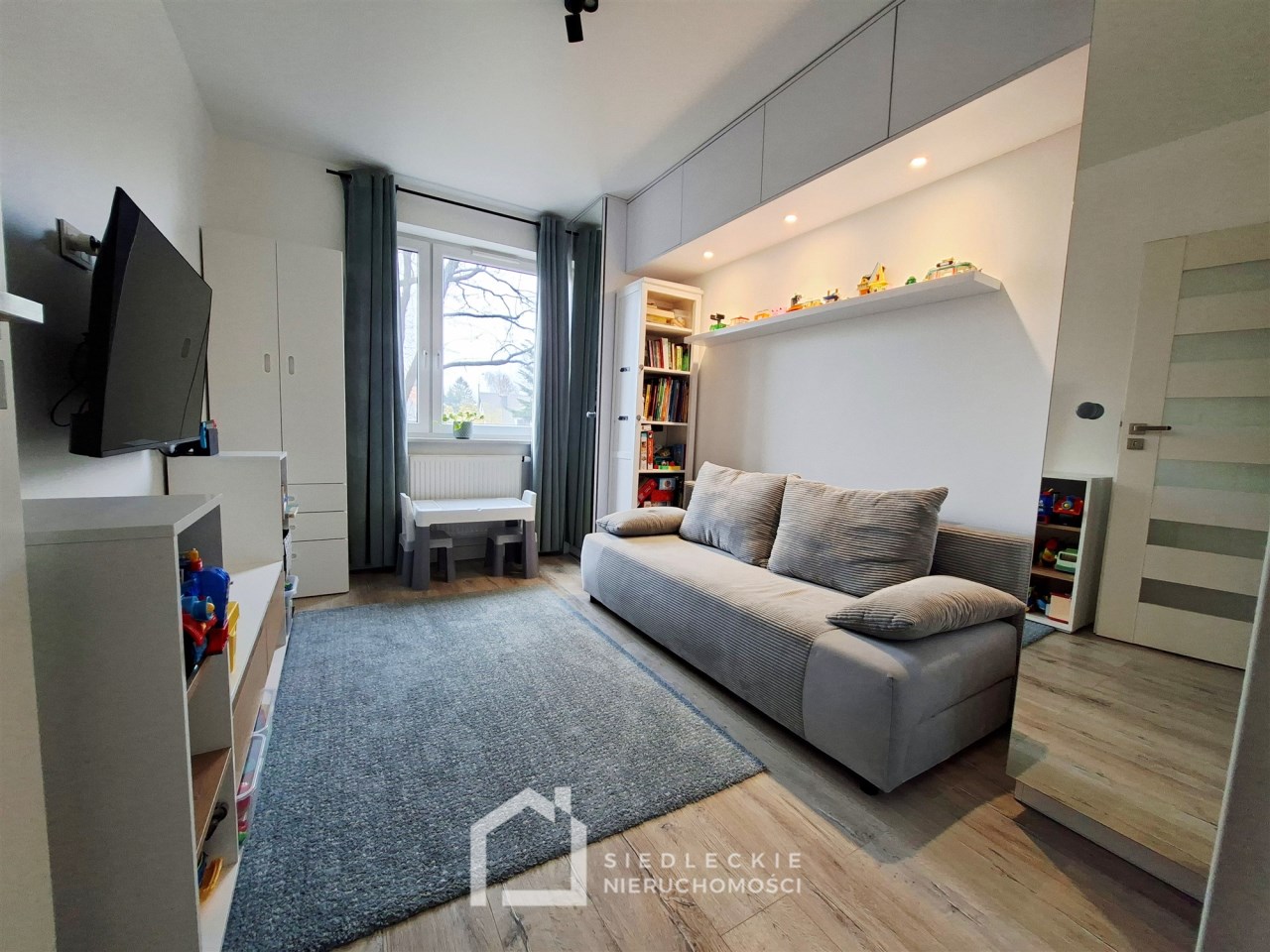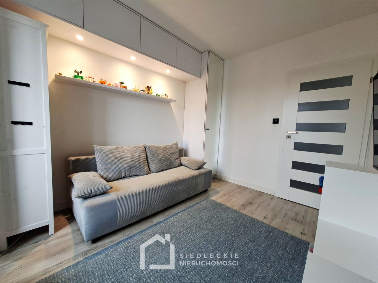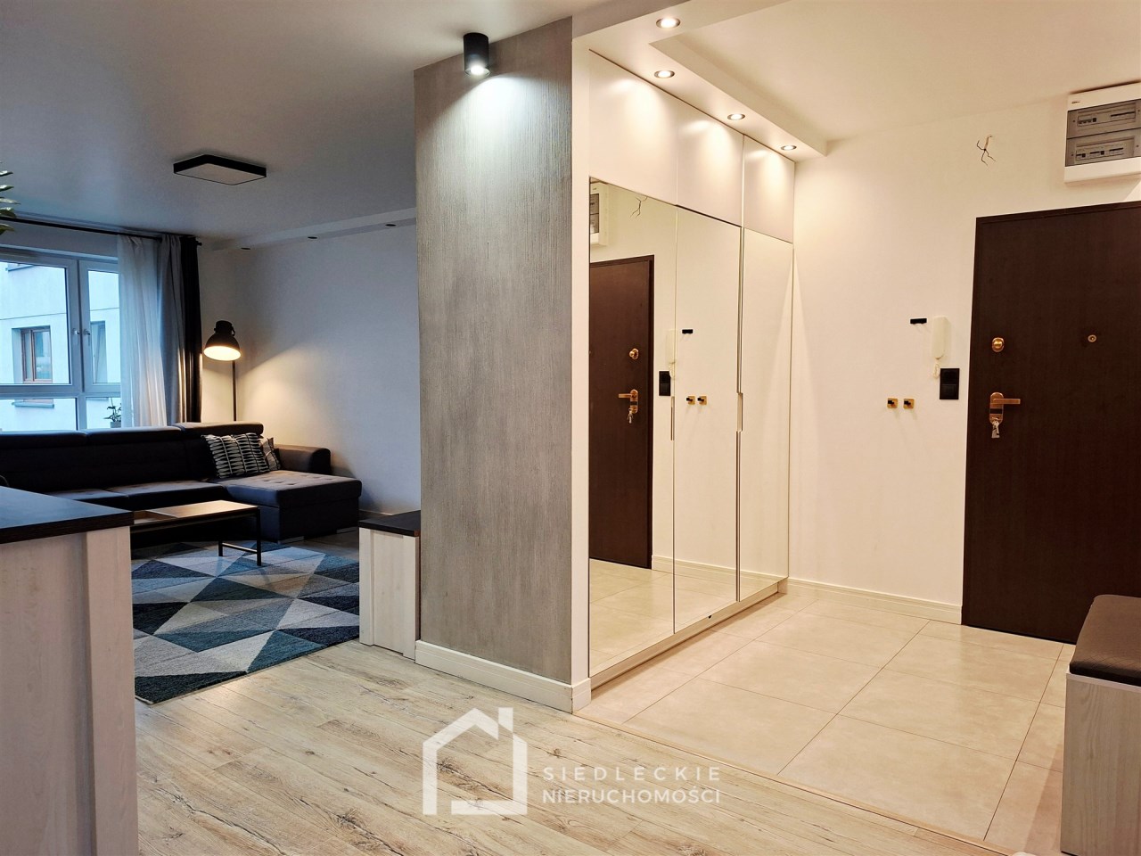 Na całej powierzchni lokalu jest dokładnie wszystko, co jest potrzebne do komfortowego mieszkania. Znajdziemy tu salon połączony z aneksem kuchennym, dwie ustawne sypialnie, duży korytarz z szafą wykonaną na wymiar, przestronną łazienkę z pralką oraz suszarką schowaną w zabudowie z dodatkowym miejscem do przechowywania.
