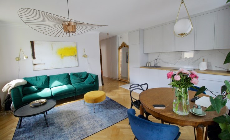 W mieszkaniu znajduje się kuchnia z meblami w zabudowie wykonana pod zamówienie i wyposażona w sprzęt AGD – płytę indukcyjną, piekarnik, lodówkę, zmywarkę oraz okap. W łazience jest pralka oraz suszarka ukryta w zabudowie.